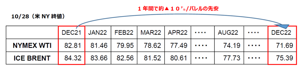 さて上記表の様に日々のニュースでも騒がれている原油高騰についてですが、実は先物市場では来年に掛けては先安感が約▲10㌦/バレルと拡大しています。