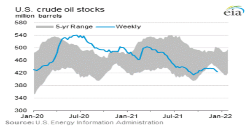 現在のオミクロンの消化はあっても、よもやよもやの「新たな変異株の出現リスク」。この辺のバランス感。以下は直近の米国原油在庫。