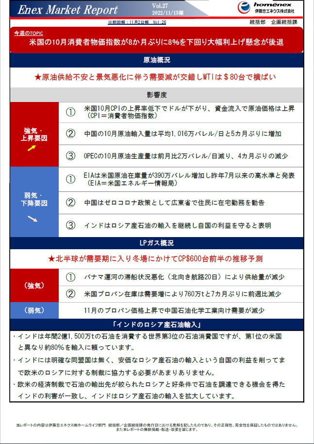 米国の10月消費者物価指数が8か月ぶりに8%を下回り大幅利上げ懸念が後退