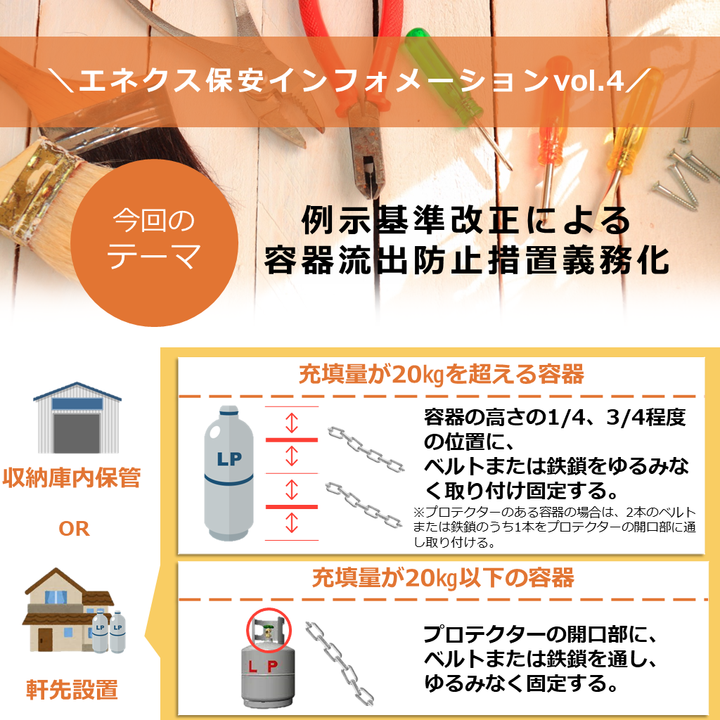 例示基準の改正が12月1日に施行され、浸水のおそれのある地域においてはLPガスの容器流出防止措置が義務付けられました。近年、豪雨や地震等の事前災害が増加しています。災害に強いエネルギーとしての役割を最大限発揮させるためにも、対策を講じましょう。