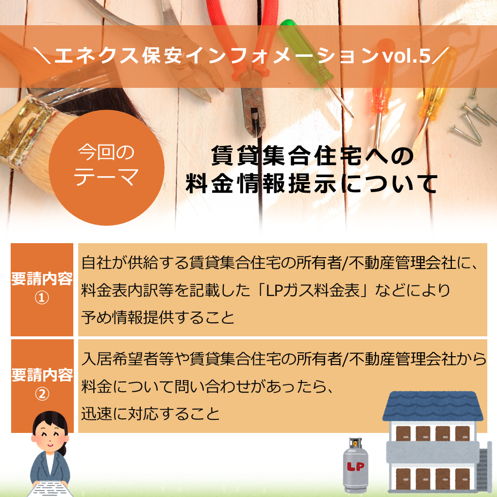 資源エネルギー庁は6月1日、全国PLガス協会に「賃貸集合住宅におけるLPガス料金の情報提供のお願い」を通知しました。背景として、現状、賃貸集合住宅では、消費者が入居前にその物件のLPガス料金を知る機会が与えられず、販売事業者を選択できないことがあげられます。取引適正化に向けて、以下の画像の内容を実行していきましょう!