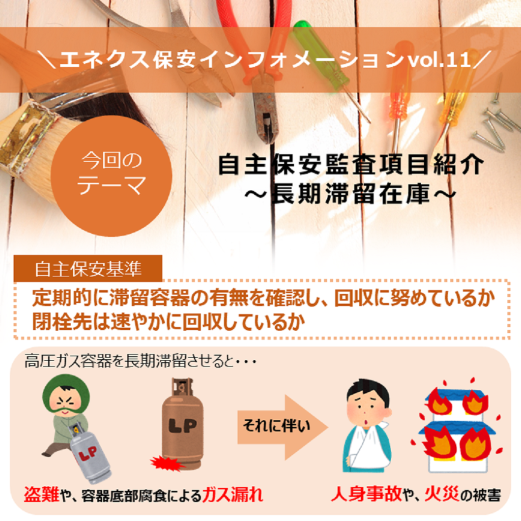 高圧ガス容器を長期滞留させると、人身事故や火災が発生する可能性があります。