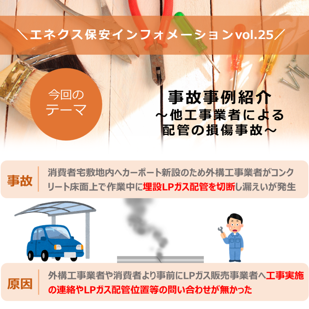 工事の際は、消費者にLPガス販売事業者へ連絡するよう周知・啓蒙、他工事業者との事前打合せや工事立合い、埋設管の表示を行う等、事故の防止に努めましょう。